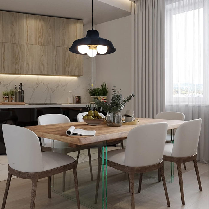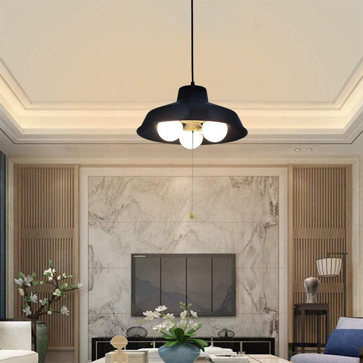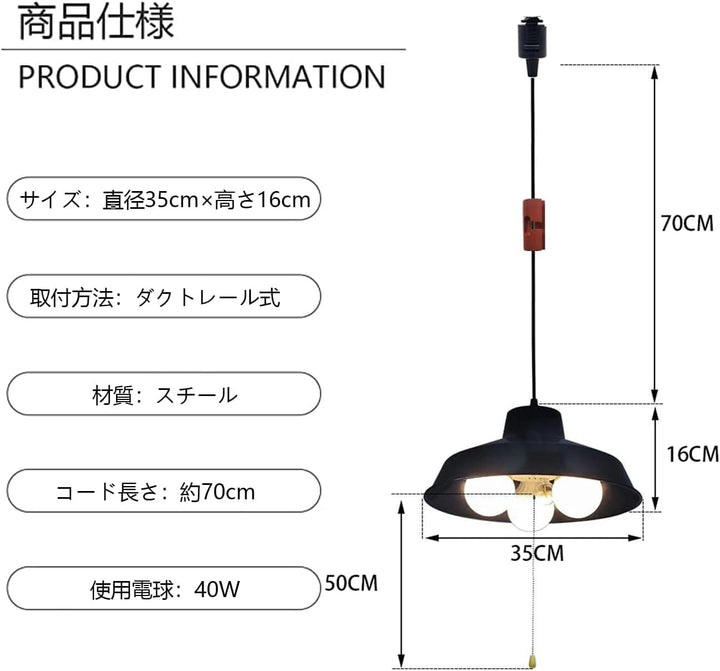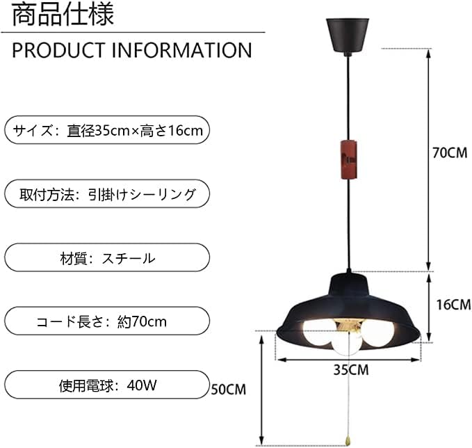 • 【商品仕様】サイズ:直径350mm×高さ160mm。カラー:ブラック。コード長さ:約70cm(長さ調整可能)。取付方法:引掛けシーリング(ワンタッチ取付)。材質:スチール。点灯方式:壁スイッチ或はプルスイッチ。使用電球:(40W)E26×3個&(40W)E12×1個。※本商品に電球は付属していません。※LED電球使用可。※ご注意:電球をあまりきつ過ぎしないように、取り付けてください。
