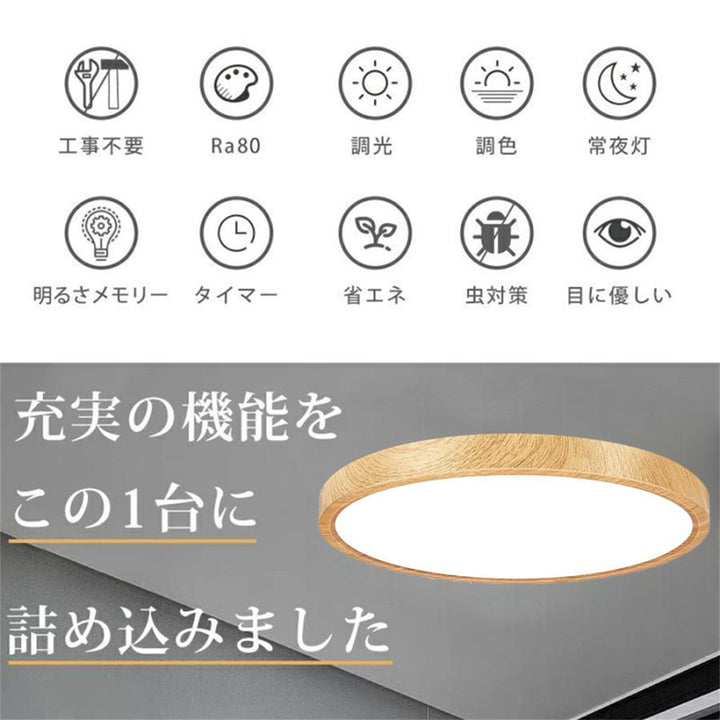 木目調の枠で、簡単なデザインで高級感の印象を与える、和室だけでなく、洋室にもなじみやすいです。高品質なLEDチップを採用し、隅々まで均一に配置しており、照明効果がより明るいになります。更に消灯前の明るさを記憶し、前回の明るさで点灯するメモリ機能があります。