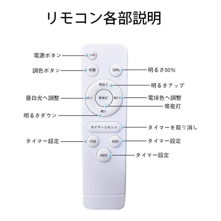 照明コントロール用のリモコンは、電源のオン/オフ、調光調色、常夜灯、タイマー機能付き、子供やお年寄りでも使いやすいです。設置場所やお好みに合わせて、照明色と明るさの調整ができます。